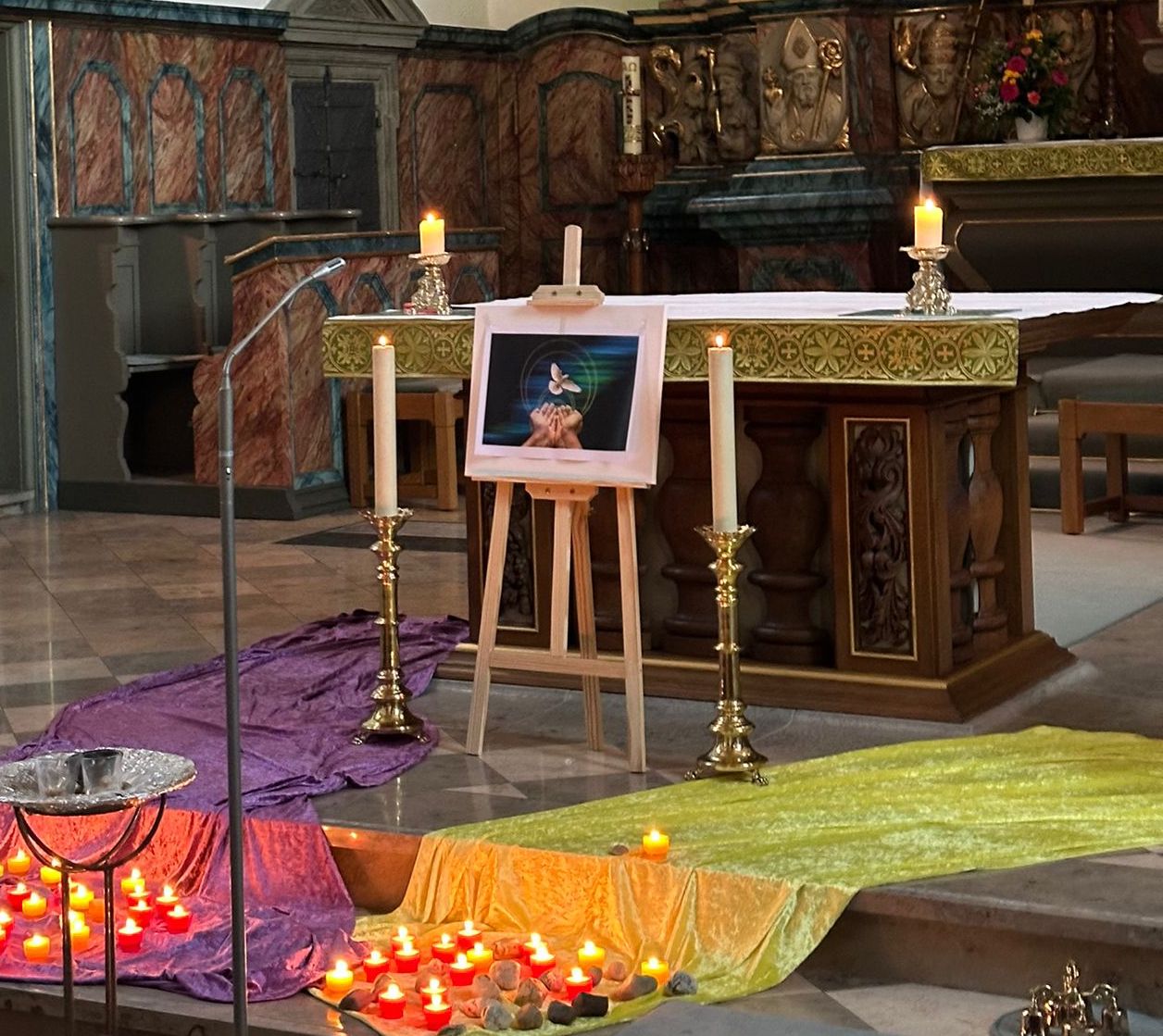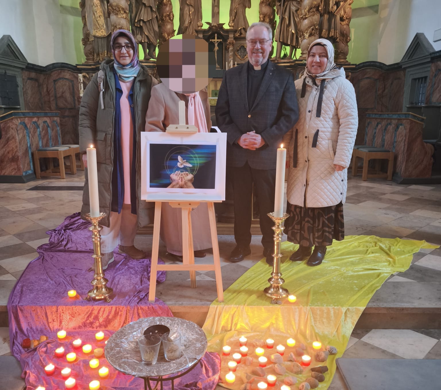 Der Altarraum war mit Kerzen, farbigen Tüchern und einem Friedenssymbol gestaltet. Das Motiv der Taube als Zeichen der Hoffnung und des Friedens begleitete die Gebete sichtbar durch die gesamte Veranstaltung. In besinnlicher Atmosphäre wurden Texte und Gebete aus dem Islam, dem Christentum und dem Judentum vorgetragen – auf Arabisch, Türkisch, Deutsch und Russisch. Trotz unterschiedlicher Sprachen und Traditionen verband alle Teilnehmenden derselbe Gedanke: Verantwortung für die Welt zu übernehmen und sich für Frieden einzusetzen.